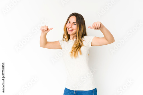 Fototapeta premium Young caucasian woman isolated on white background raising both thumbs up, smiling and confident.