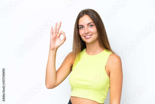 Fototapeta premium Young caucasian woman isolated on white background showing ok sign with fingers