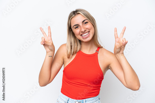 Fototapeta premium Young caucasian woman isolated on white background showing victory sign with both hands