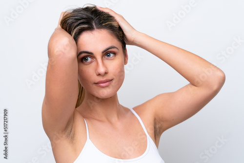 Naklejka premium Young caucasian woman isolated on white background touching her hair. Close up portrait