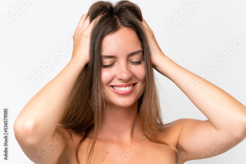 Fototapeta premium Young caucasian woman isolated on white background with happy expression....
