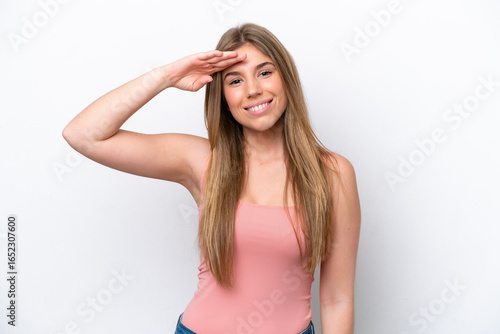Fototapeta premium Young caucasian woman isolated on white bakcground saluting with hand with happy expression