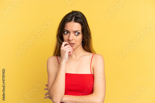Fototapeta premium Young caucasian woman isolated on yellow background nervous and scared
