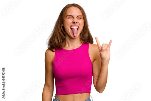Fototapeta premium Young caucasian woman isolated showing rock gesture with fingers