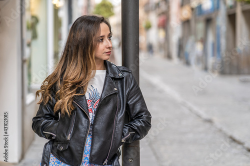 Fototapeta premium Young caucasian woman leaning on a street lamp in a city