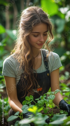 Fototapeta premium Young Caucasian woman nurturing plants in a lush garden, showing dedication and care for nature.