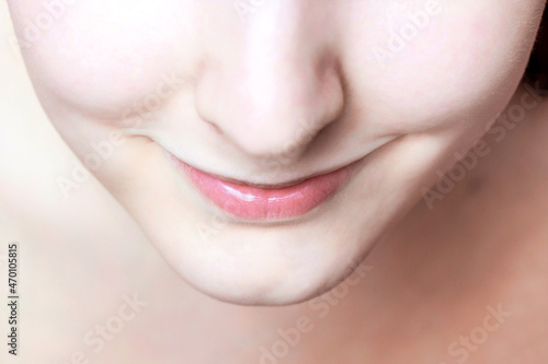 Obraz premium Young caucasian woman smiling face with clean skin and lips. Spa, skincare,...