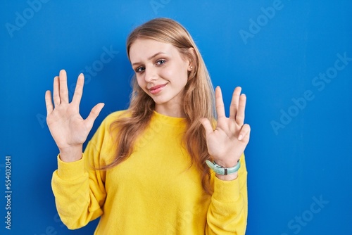 © Krakenimages.com, Fototapeta premium Young caucasian woman standing over blue background showing and pointing up with fingers number nine while smiling confident and happy.