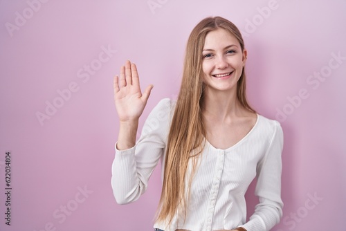 Fototapeta premium Young caucasian woman standing over pink background waiving saying hello happy and smiling, friendly welcome gesture
