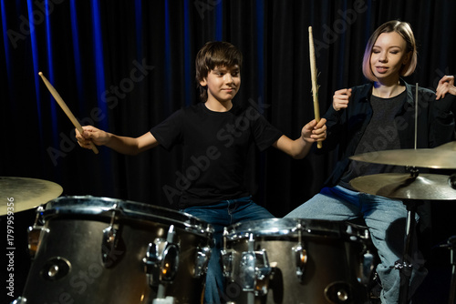 Fototapeta premium Young caucasian woman teaches a boy to play the drums in the studio on a...