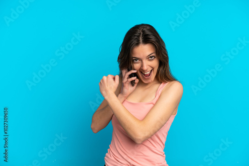 Fototapeta premium Young caucasian woman using mobile phone isolated on blue background celebrating a victory