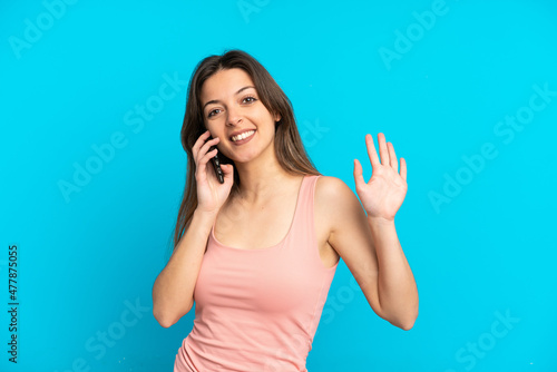 Fototapeta premium Young caucasian woman using mobile phone isolated on blue background saluting...