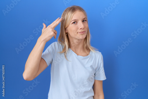 Fototapeta premium Young caucasian woman wearing casual blue t shirt shooting and killing oneself pointing hand and fingers to head like gun, suicide gesture.