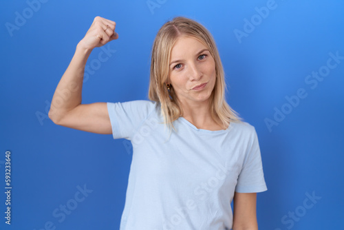 Fototapeta premium Young caucasian woman wearing casual blue t shirt strong person showing arm muscle, confident and proud of power
