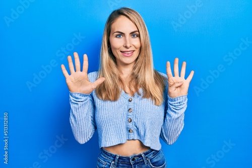 Fototapeta premium Young caucasian woman wearing casual clothes showing and pointing up with fingers number nine while smiling confident and happy.