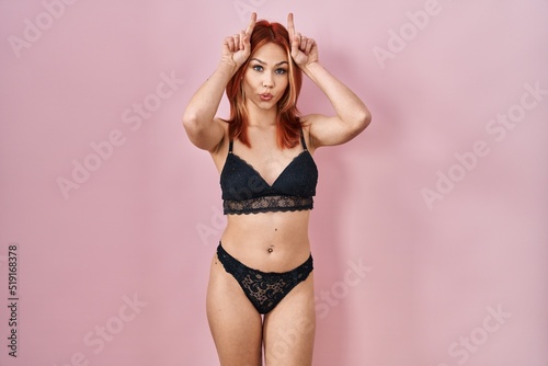 © Krakenimages.com, Obraz premium Young caucasian woman wearing lingerie over pink background doing funny gesture with finger over head as bull horns