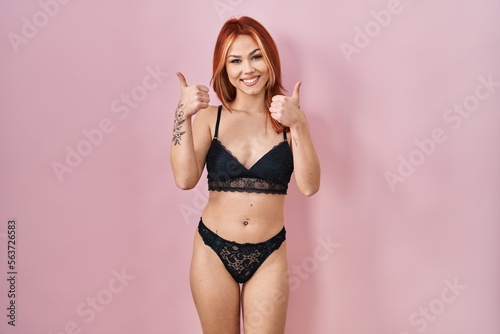 © Krakenimages.com, Obraz premium Young caucasian woman wearing lingerie over pink background success sign doing positive gesture with hand, thumbs up smiling and happy. cheerful expression and winner gesture.