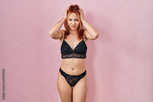 Obraz premium Young caucasian woman wearing lingerie over pink background suffering from headache desperate and stressed because pain and migraine. hands on head.