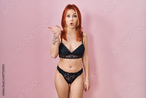 © Krakenimages.com, Obraz premium Young caucasian woman wearing lingerie over pink background surprised pointing with hand finger to the side, open mouth amazed expression.