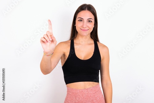Fototapeta premium Young caucasian woman wearing sportswear over white background showing and pointing up with fingers number one while smiling confident and happy.