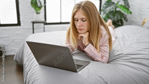 © Krakenimages.com, Naklejka premium Young caucasian woman with blonde hair intently using a laptop while lying on a bed in a bright modern bedroom