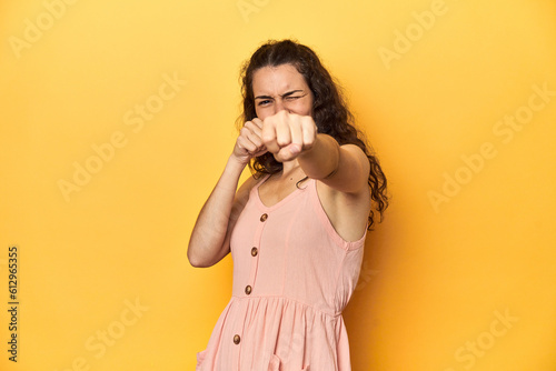 © Asier, Obraz premium Young Caucasian woman, yellow studio background, throwing a punch, anger, fighting due to an argument, boxing.