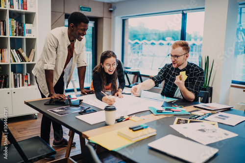 © BullRun, Fototapeta premium Young cheerful colleagues drawing plan