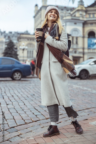 © Yaroslav Astakhov, Fototapeta premium Young cheerful lady outdoors and indoors