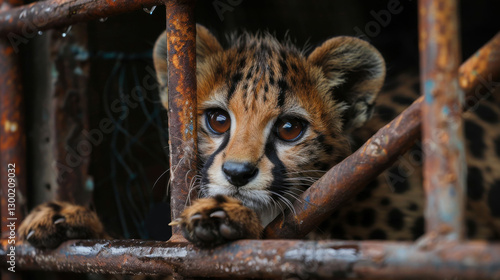 © DJINN 369, Naklejka premium Young Cheetah Gazing Through Rusty Cage Bars Reflects Optimism Amidst Wildlife Conservation Challenges