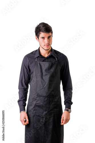 Fototapeta premium Young chef or waiter posing, wearing black apron and shirt isolated on white...