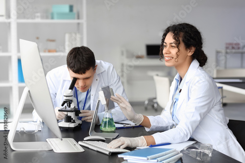 Obraz premium Young chemists working at table in laboratory