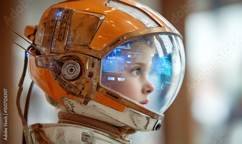 Fototapeta premium Young child in orange astronaut helmet with heads up display looking to the side with futuristic gear