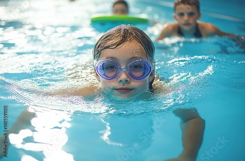 Naklejka premium Young child with swimming goggles swimming in a pool with other children in the background during a swim lesson or playtime