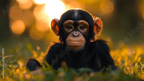 © Ibnu, Fototapeta premium Young Chimpanzee Sitting In Golden Sunset Light