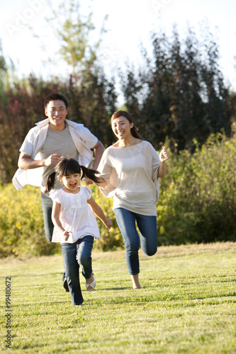 © Blue Jean Images, Fototapeta premium Young Chinese family running in a field
