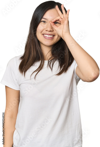 Fototapeta premium Young Chinese woman excited keeping ok gesture on eye.