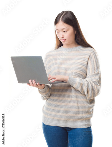 © Krakenimages.com, Fototapeta premium Young Chinese woman over isolated background using computer laptop with a confident expression on smart face thinking serious