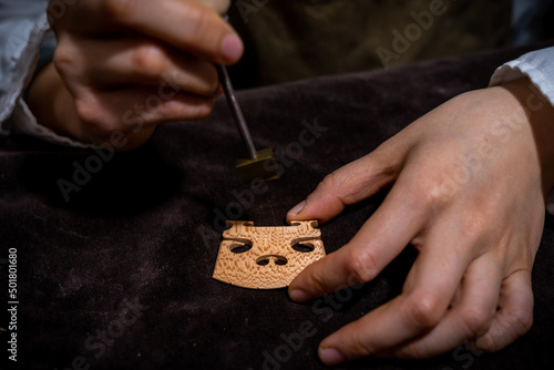 Fototapeta premium young Chinese woman violin maker signs the jumper of her violin with fire...