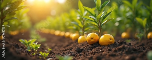 © miss irine, Fototapeta premium Young citrus plants grow in dark soil rows. Ripe oranges sit on ground near fresh saplings. Sun shines warmly on lush green leaves and fruit crop.