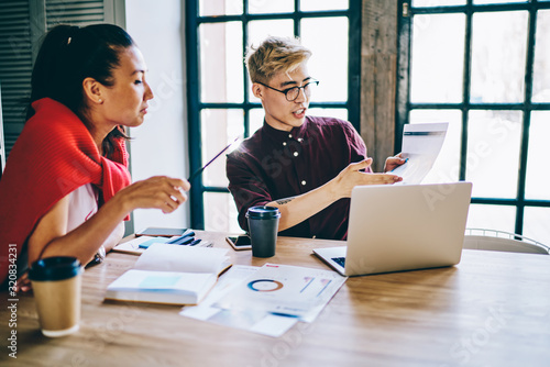 Fototapeta premium Young colleagues checking diagram in office