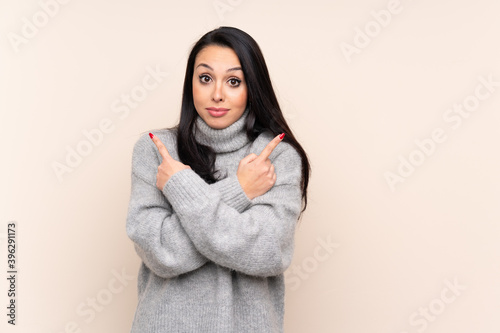 Obraz premium Young Colombian girl over isolated background pointing to the laterals having...