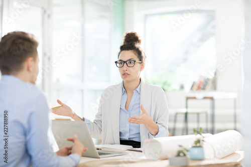 Obraz premium Young confident female expert explaining her colleague her viewpoint about...