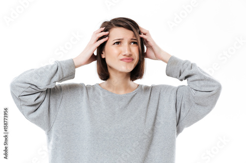 © Drobot Dean, Naklejka premium Young confused woman keeping her hands on head