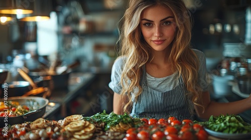 © Рудой Максим, Obraz premium Young cook preparing fresh vegetables and herbs in a vibrant kitchen during a sunny afternoon