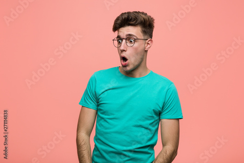 Fototapeta premium Young cool caucasian man being shocked because of something she has seen.
