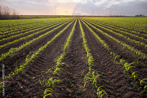 © Sondem, Obraz premium young corn plants on cornfield against sunset.