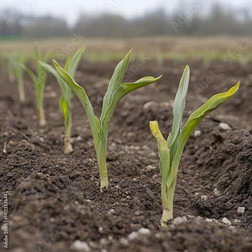 Fototapeta premium Young Corn Seedlings Emerging from Soil in a Field