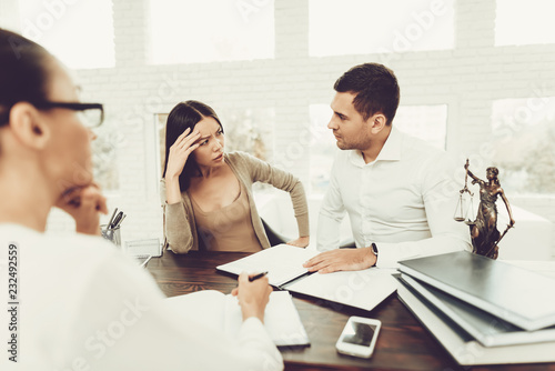 Fototapeta premium Young Couple Came To Lawyer. Divorce Concept.