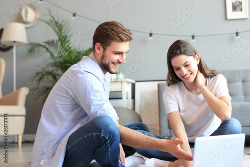 Fototapeta premium Young couple doing some online shopping at home, using a laptop on floor.