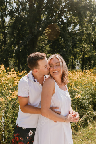 Fototapeta premium Young couple embracing and smiling in front of wildflowers